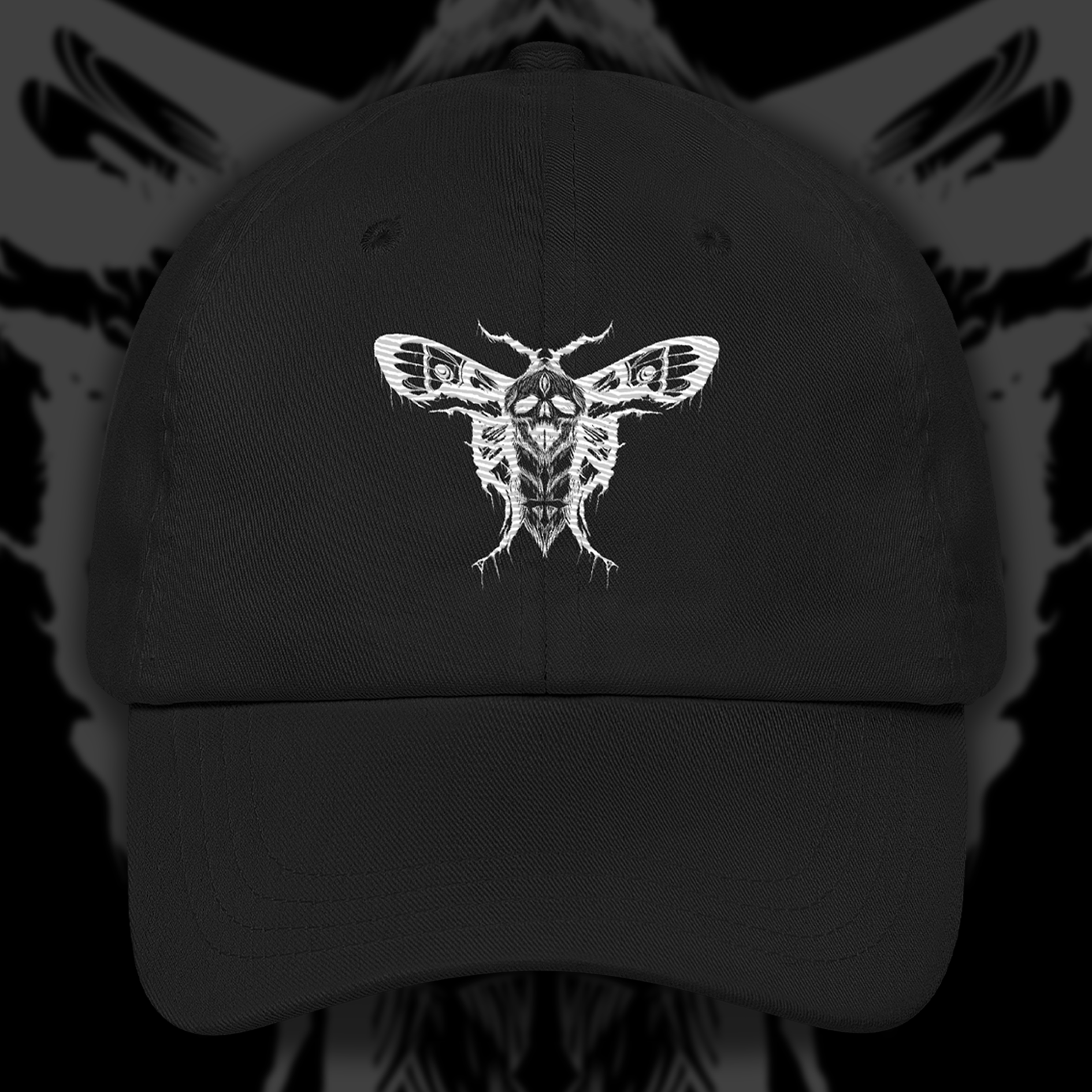 Elevate your style with the ABYSSMOTH Dad Hat, designed by DevastatedMind for those who appreciate a unique, dark aesthetic. This classic black cap features an intricately embroidered moth logo with gothic details and a subtle, edgy vibe. The embroidered design adds a touch of depth and texture, making it stand out while staying versatile and wearable.