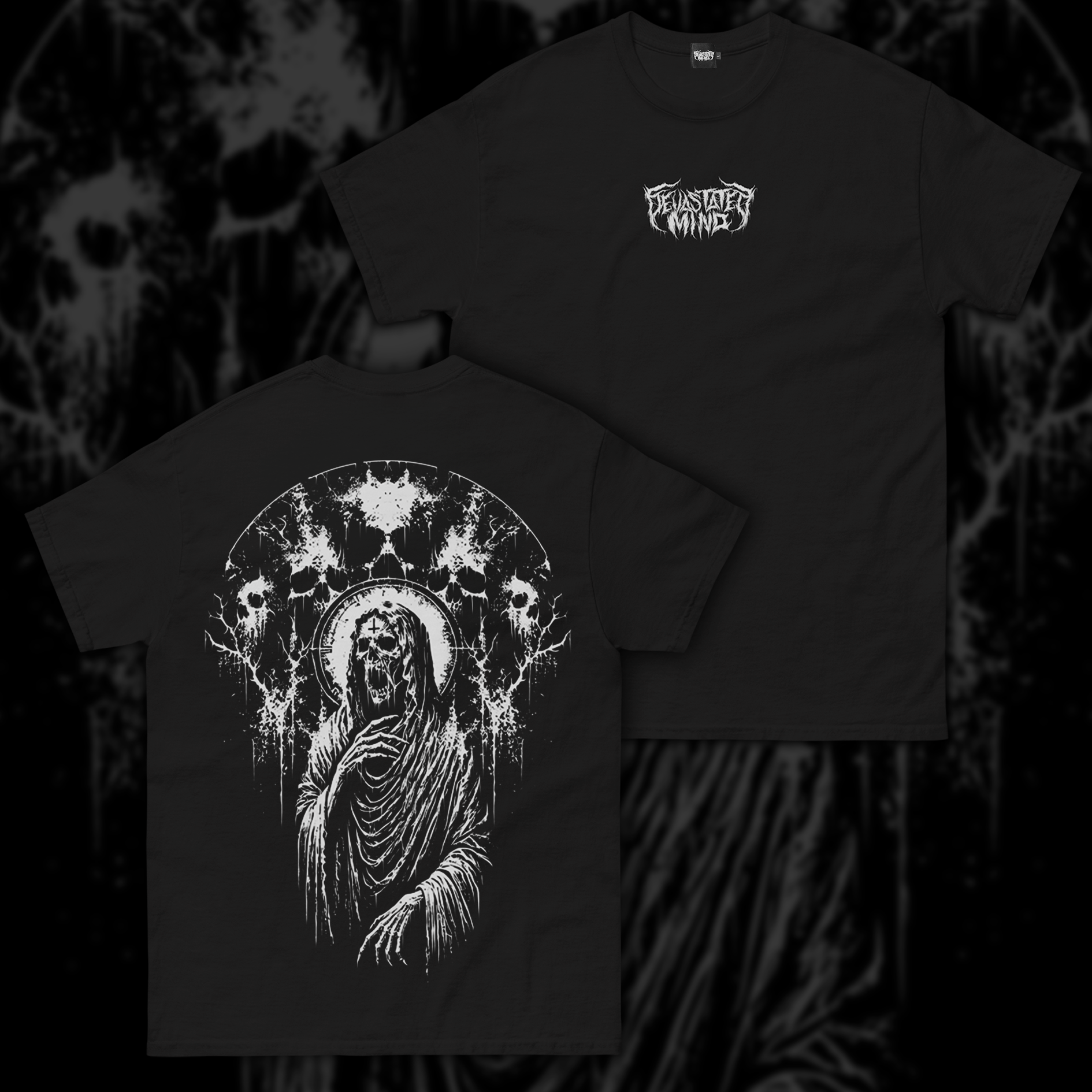 The front bears the Devastated Mind logo, printed in stark detail, echoing themes of despair and defiance. Made for those who walk the line between light and shadow, this hoodie will shroud you in a look that’s equal parts chilling and captivating. Slip it on, embrace the void, and let the decay consume you.