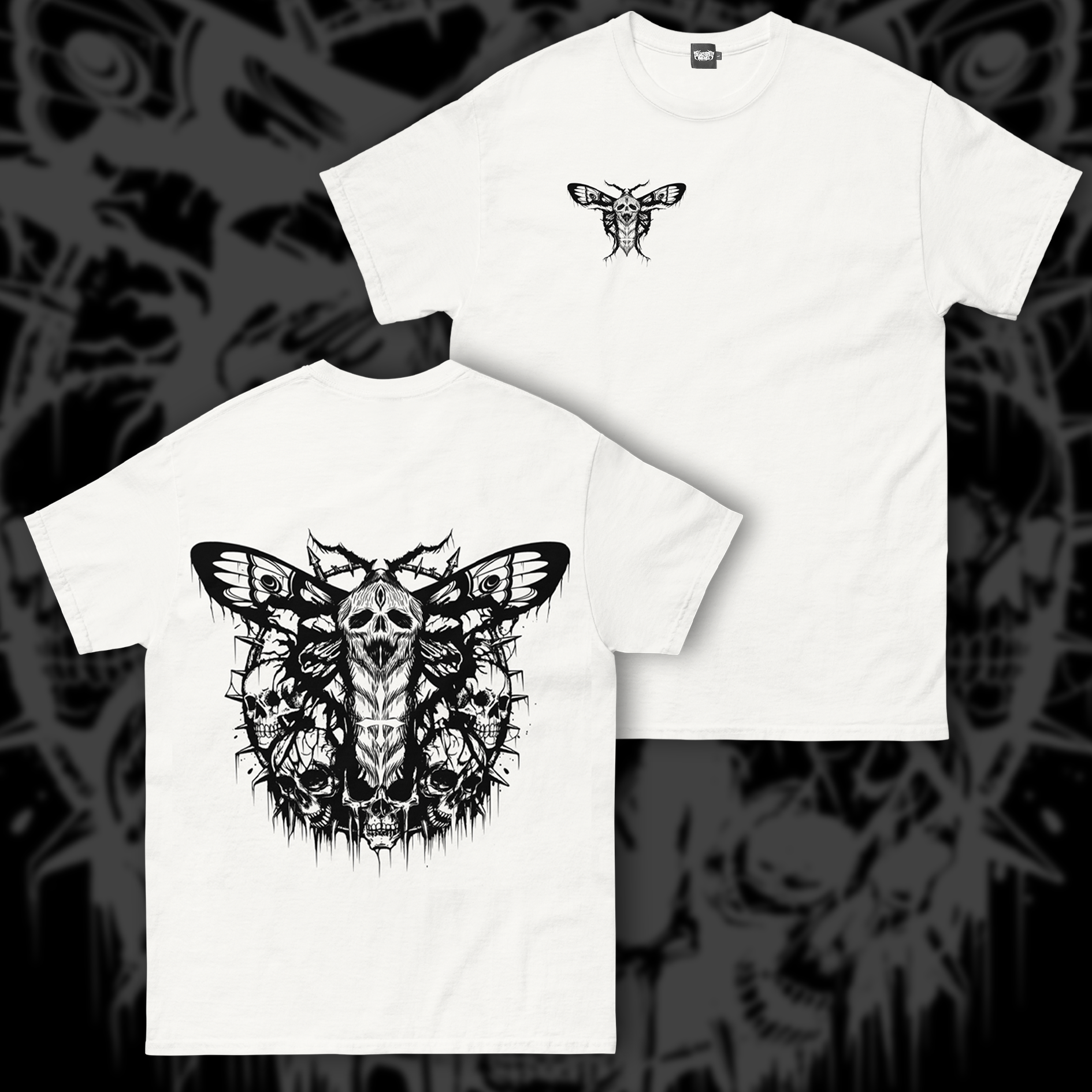 Unleash your dark side with the ABYSSMOTH t-shirt, a striking design that merges streetwear aesthetics with deathcore influence. Featuring an intricate moth graphic with a skull at its core, this shirt captures the essence of rebellion and mystery. The back displays a larger, hauntingly detailed moth illustration that makes a bold statement, perfect for those who embrace the unconventional. Made with premium fabric for comfort and durability, the ABYSSMOTH t-shirt is more than just apparel it's a piece of wearable art. Ideal for fans of edgy, alternative fashion, this shirt is a must have for anyone looking to stand out.